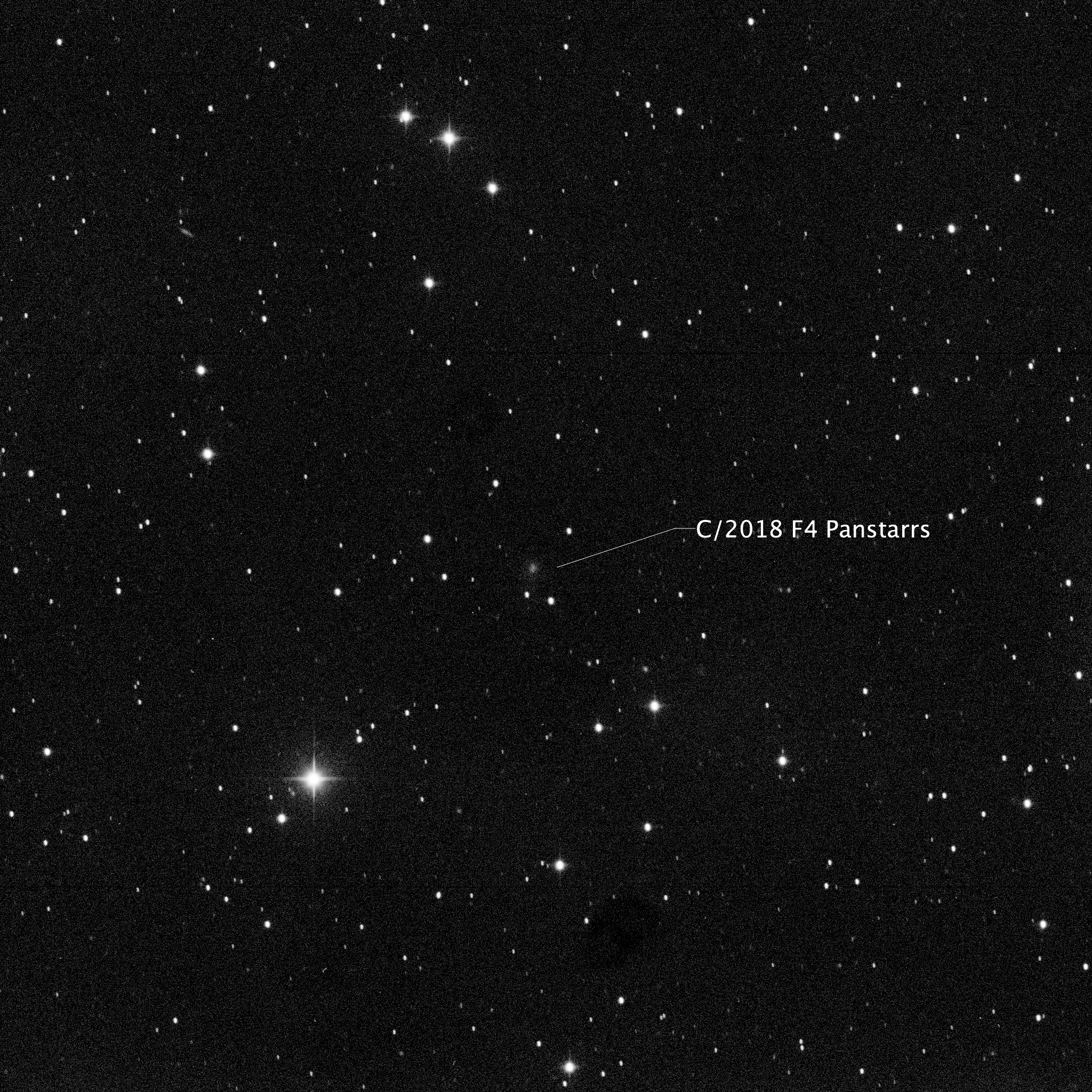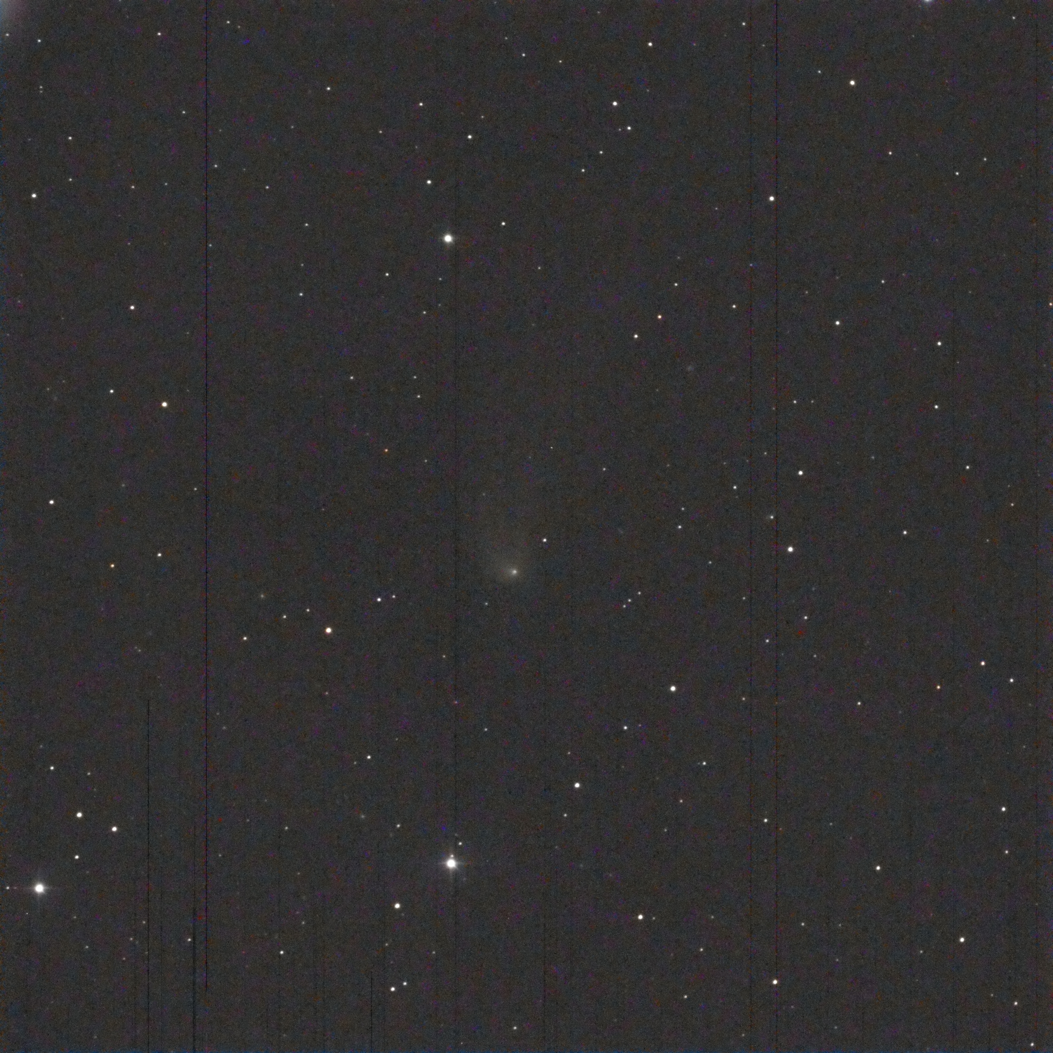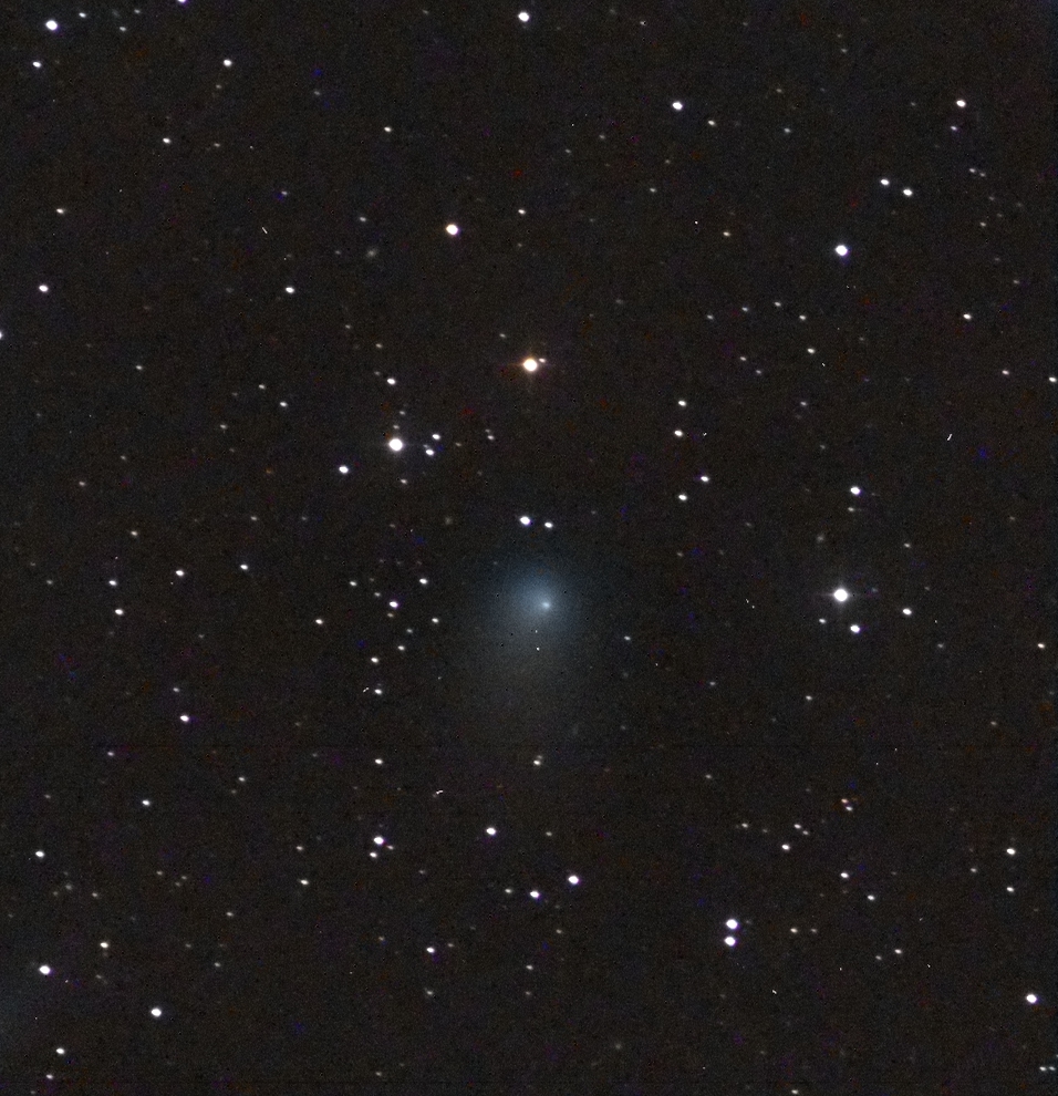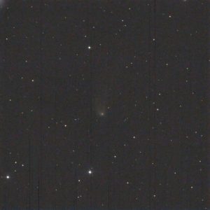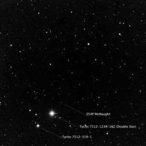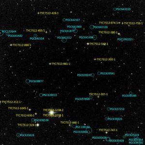 Left to Right: In the photo, note the two stars in the lower left corner. In the center photo, which is an annotated image of the plate solve, you can see those two prominent stars labelled as Tycho 7512-319-1 (lower) and Tycho 7512-1238-1 and its companion, Tycho 7512-1238-2. The rightmost photo is a screenshot from Sky Safari (same date and time as the photo). Note how the two stars, along with the Comet, form a straight line, and how the objects are almost evenly spaced from each other. In the leftmost photo, I have identified what I think is the Comet using this rationale. It is very faint — magnitude 18.