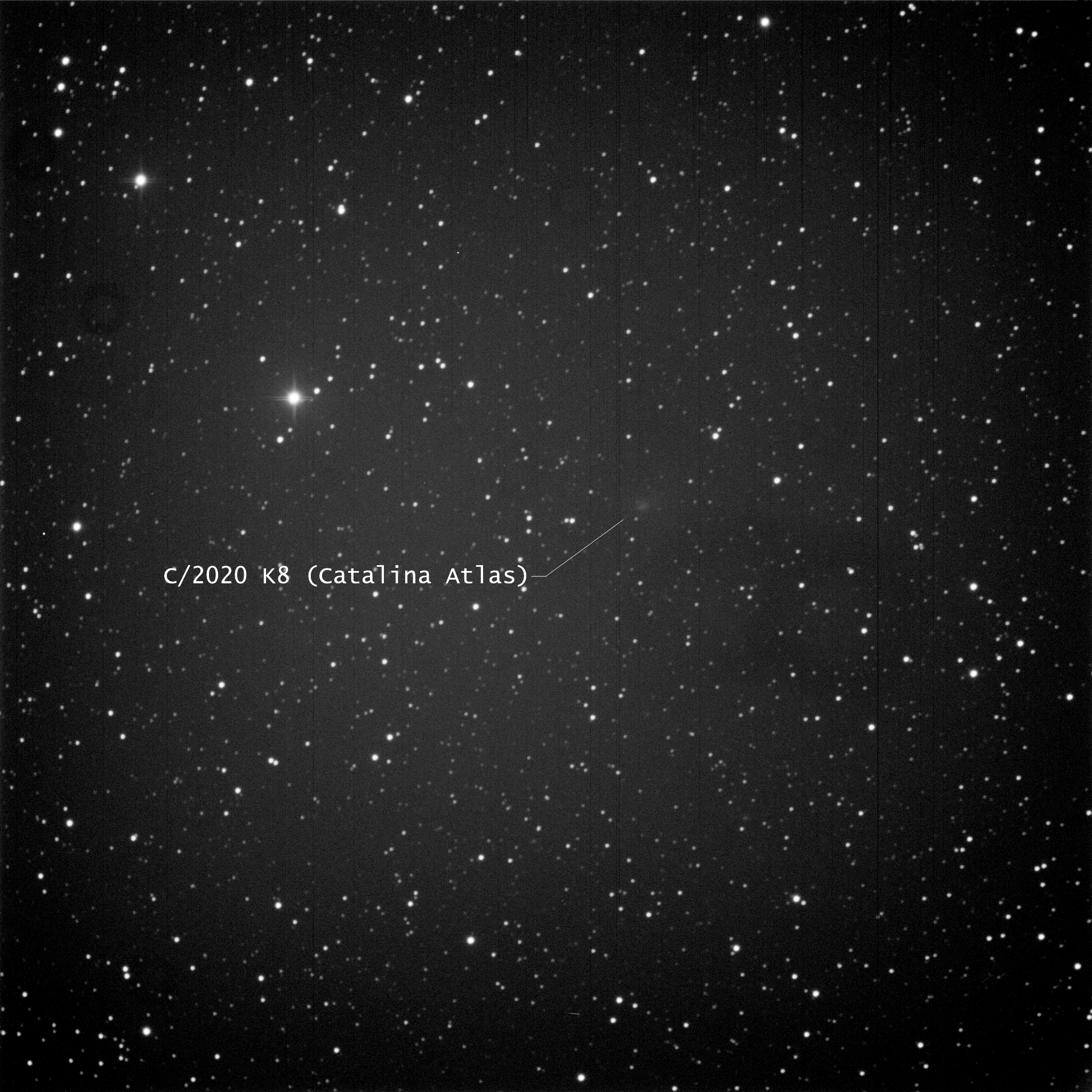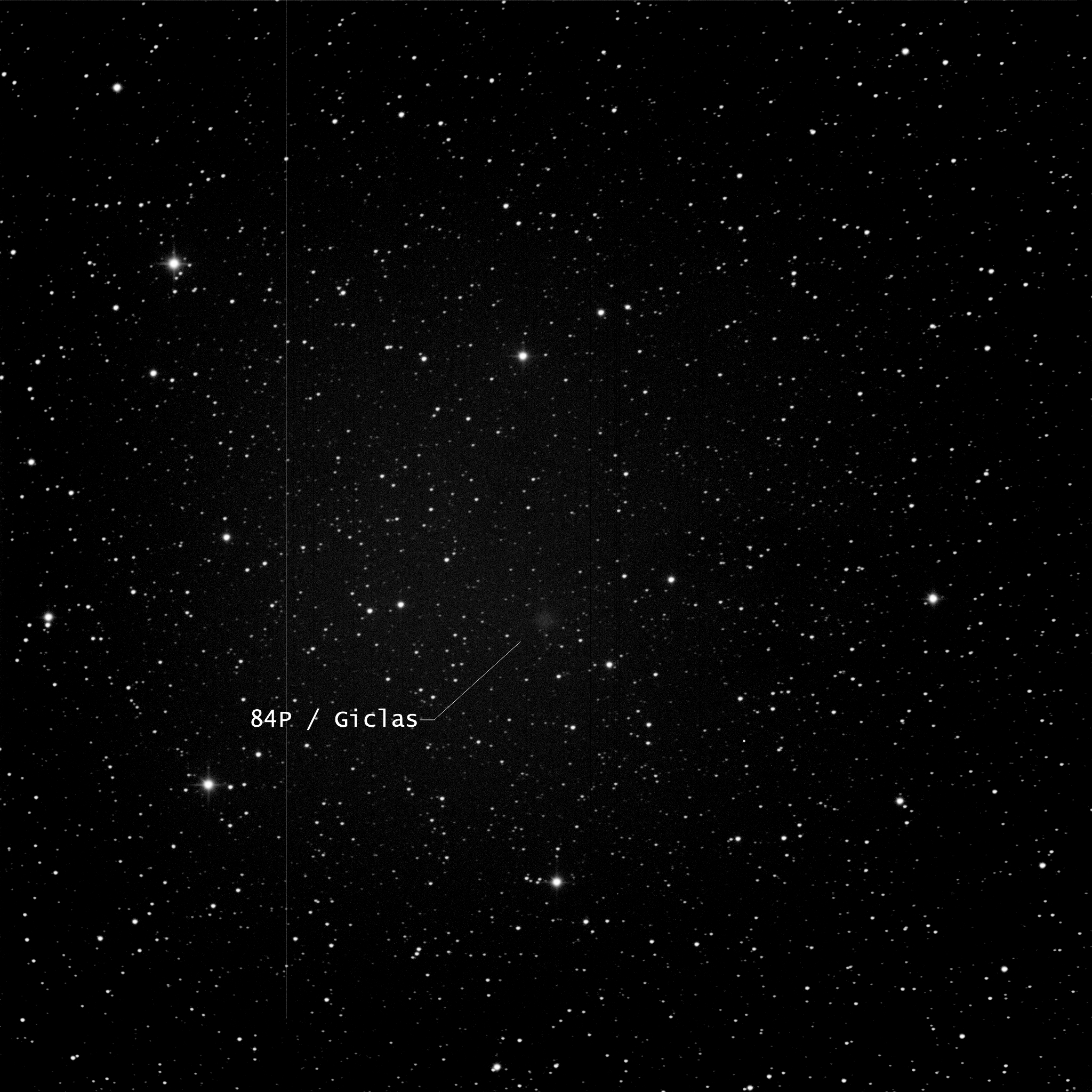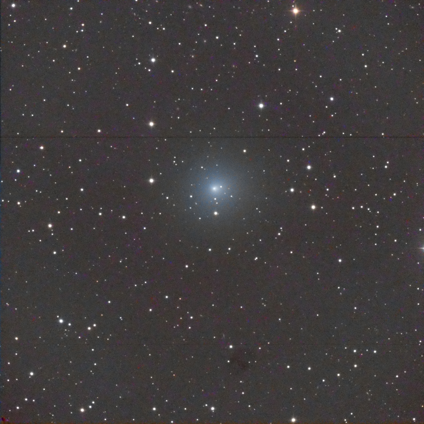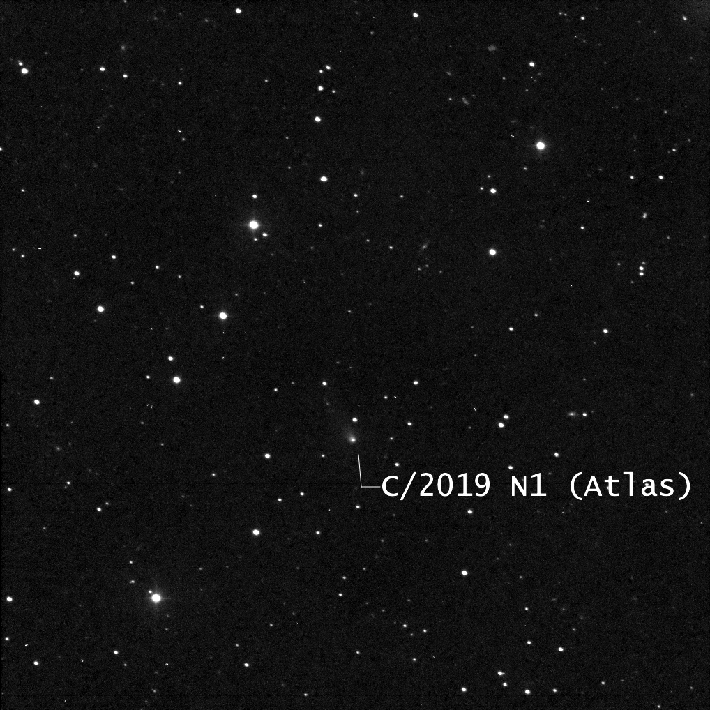 Left to Right: In the photo, note the two stars in the lower left corner. In the center photo, which is an annotated image of the plate solve, you can see those two prominent stars labelled as Tycho 7512-319-1 (lower) and Tycho 7512-1238-1 and its companion, Tycho 7512-1238-2. The rightmost photo is a screenshot from Sky Safari (same date and time as the photo). Note how the two stars, along with the Comet, form a straight line, and how the objects are almost evenly spaced from each other. In the leftmost photo, I have identified what I think is the Comet using this rationale. It is very faint — magnitude 18.