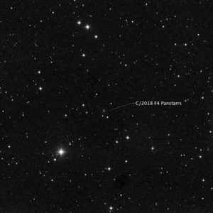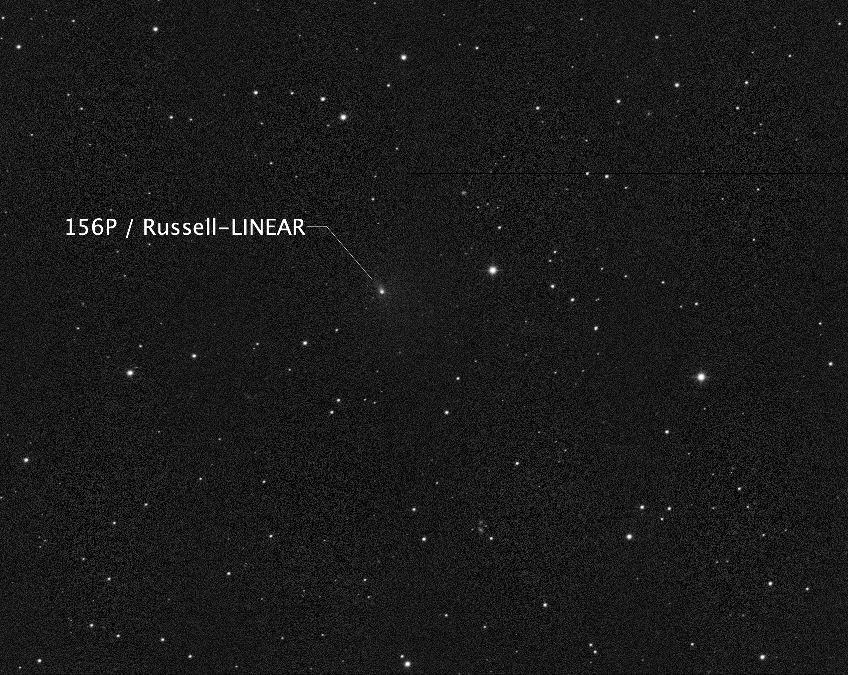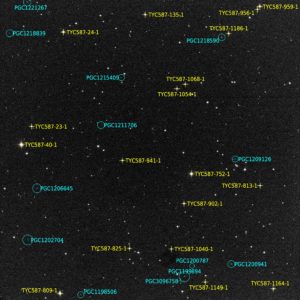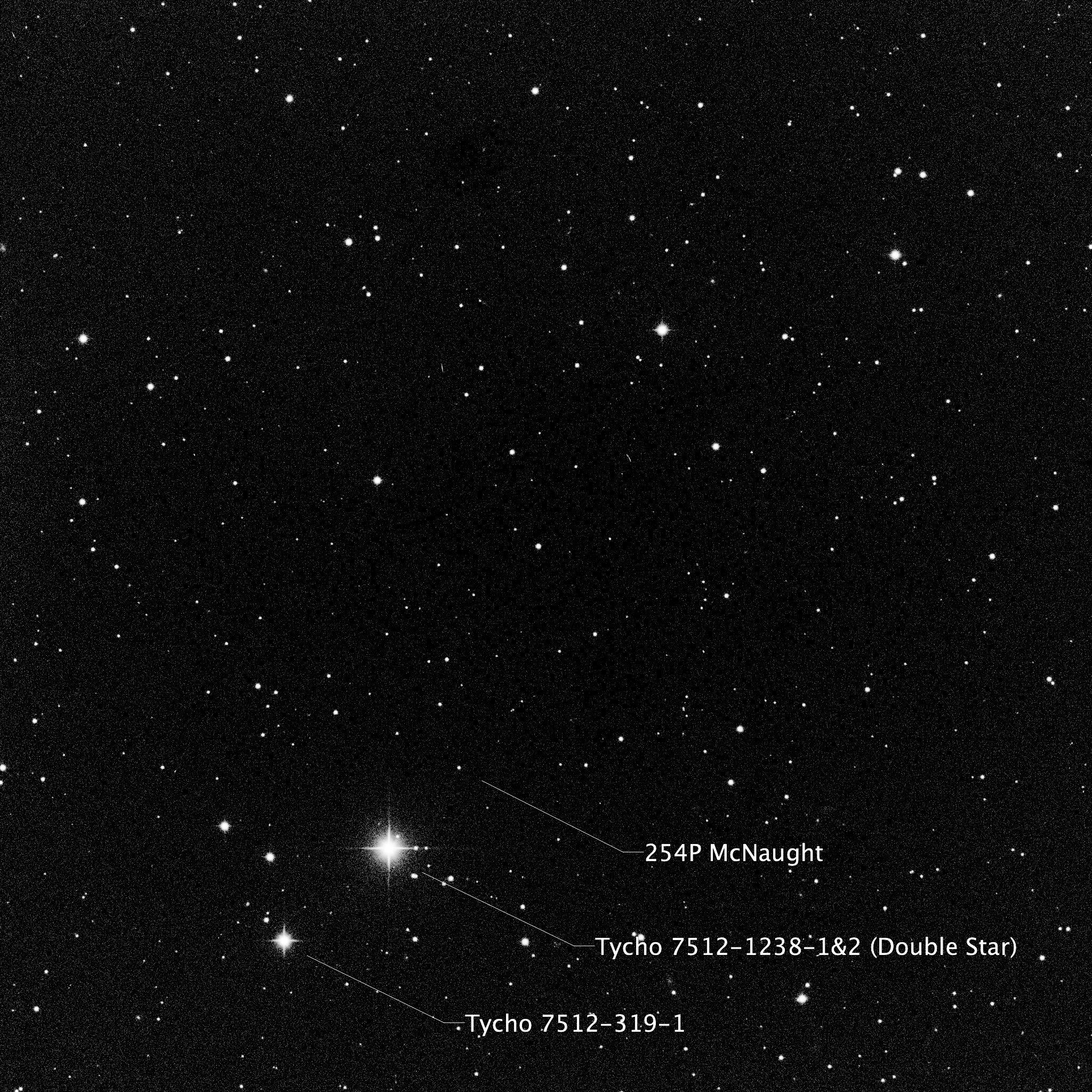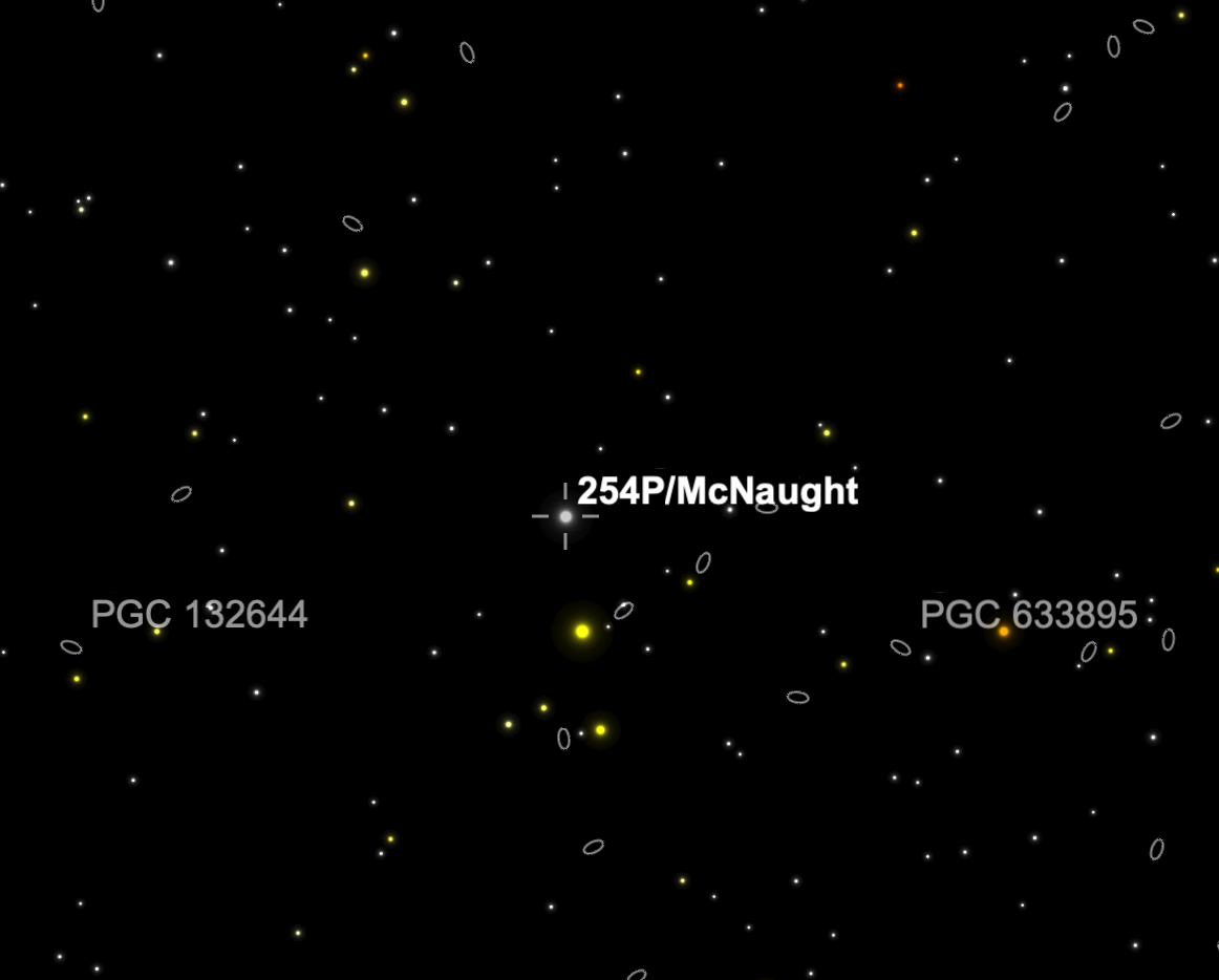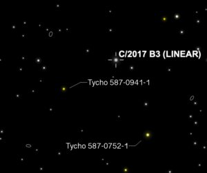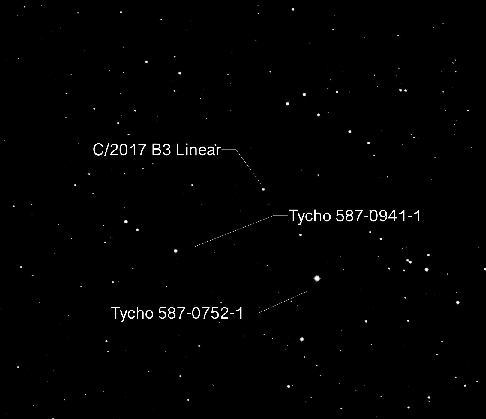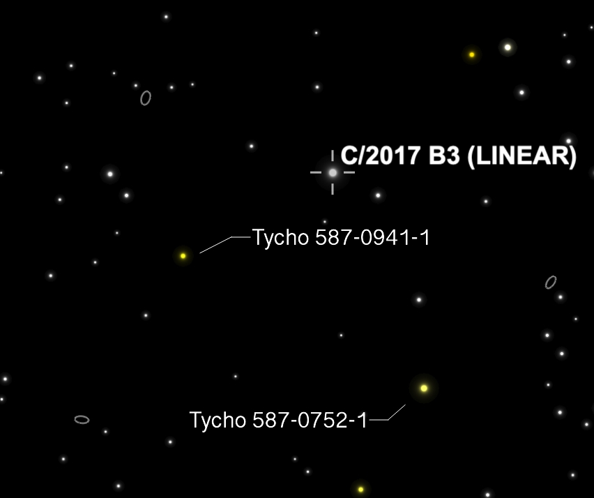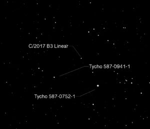 Left to Right: In the photo, note that the Comet, Tycho 0587-0941-1, and Tycho 0587-0752-1 form a triangle. You can see this plainly in the center photo, which is a screenshot from Sky Safari (same date and time as the photo). The rightmost photo is an annotated image of the plate solve to show the identifications of the stars. Notice that the distance between the lower left star and the Comet is slightly shorter than the distance between the lower left star and the lower right star.