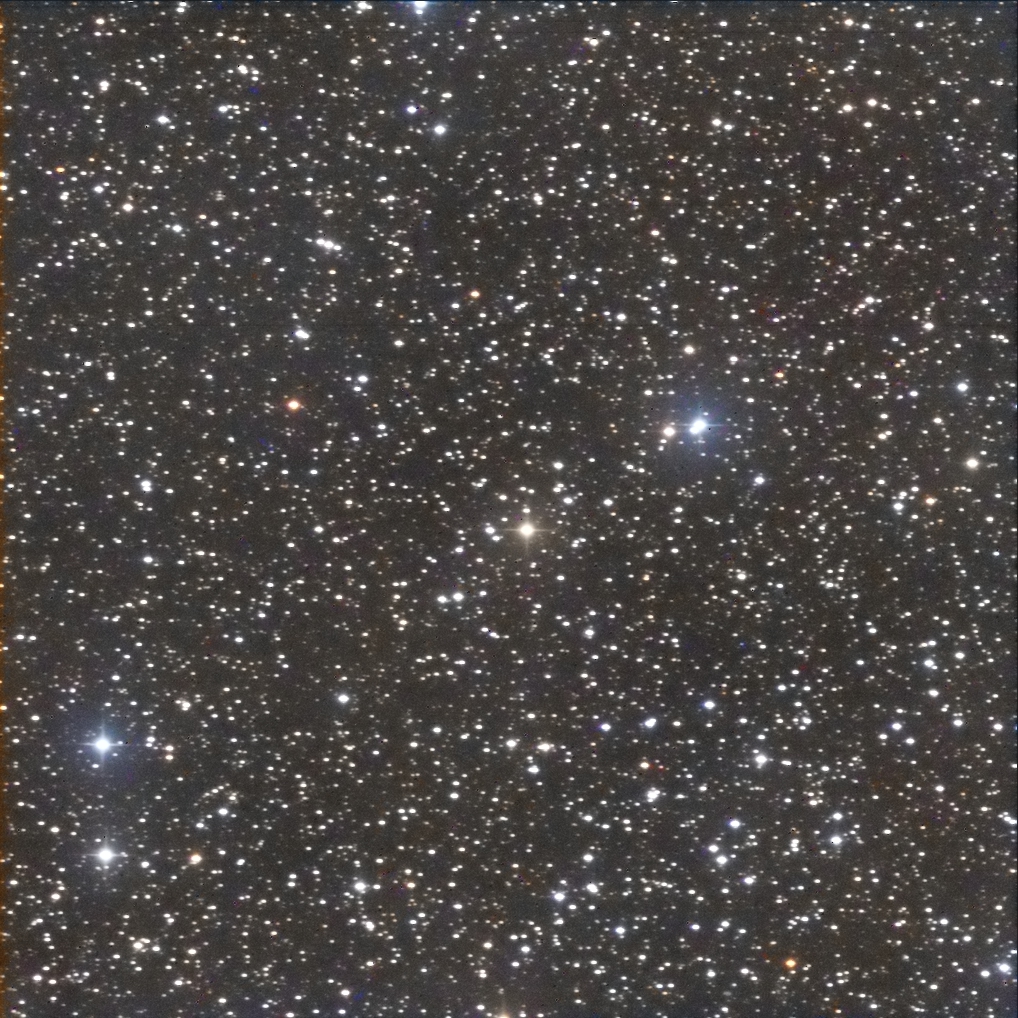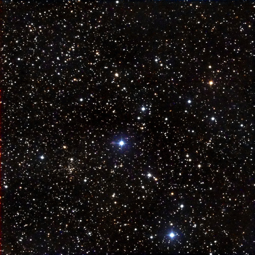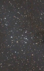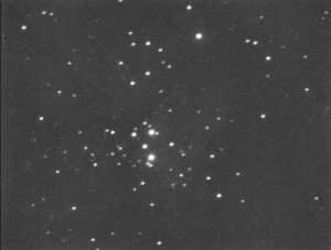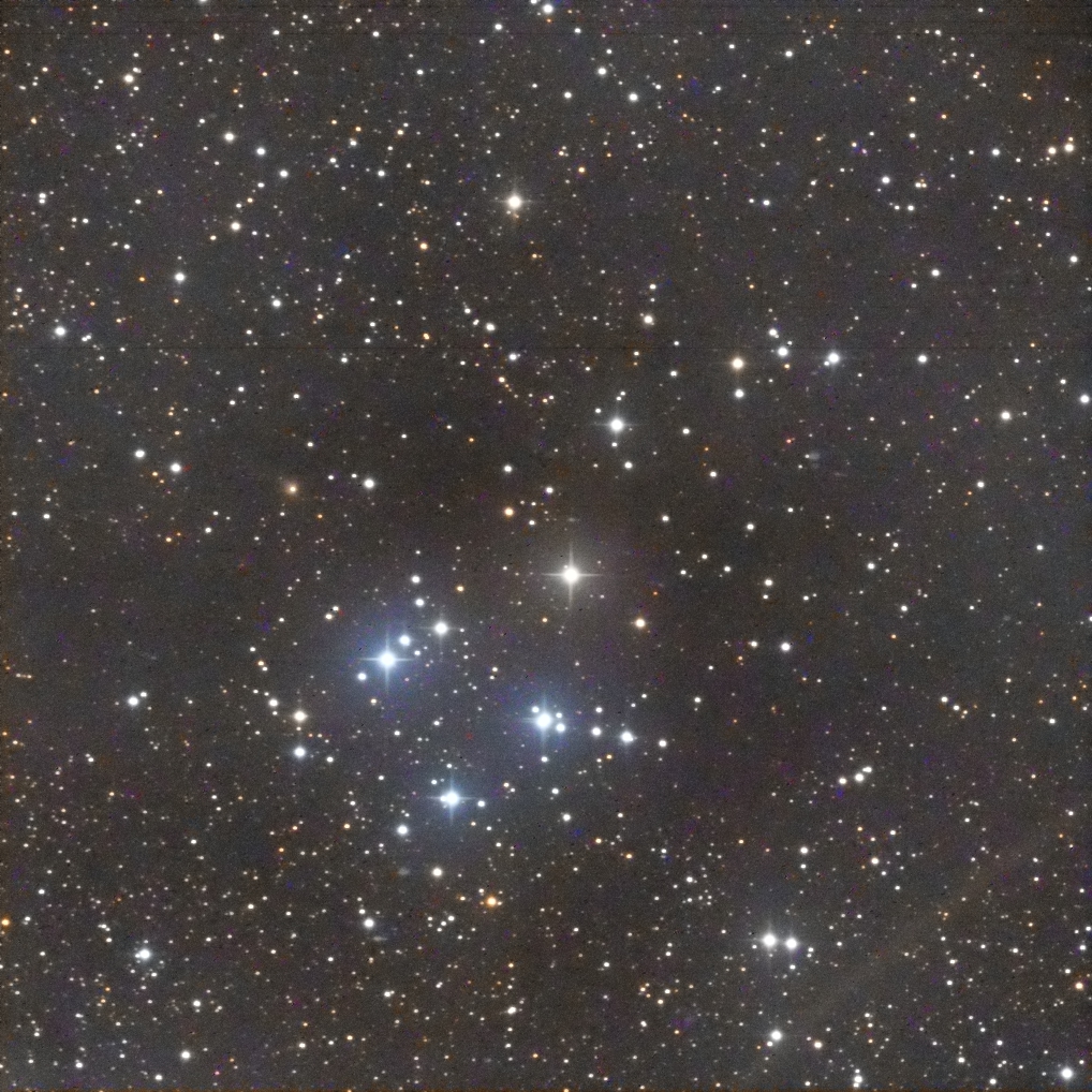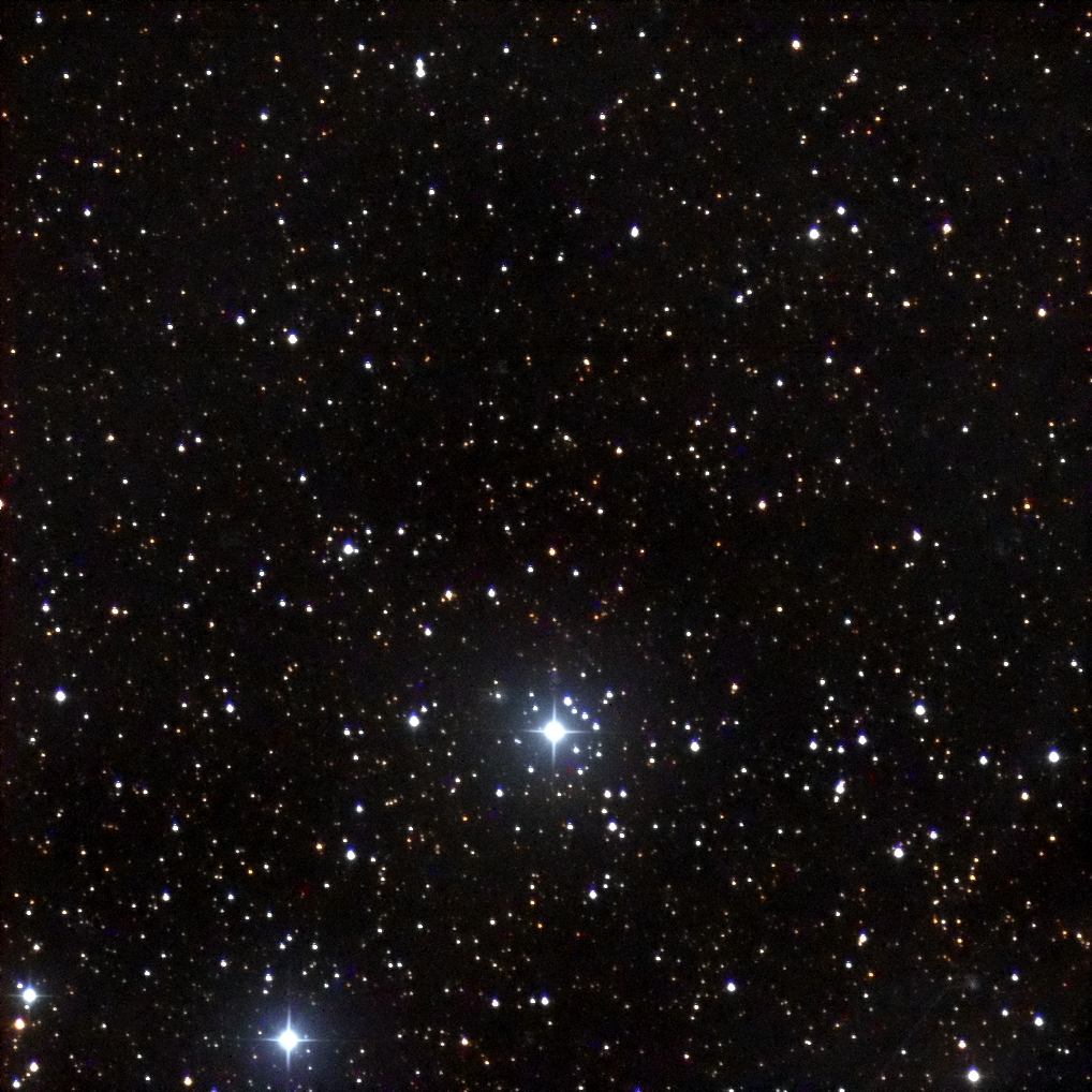 I targeted the bright star in the middle of the frame, SAO 23469.  It lies in the center of the cluster.  I had to crop out some very bad blemishes in the photo.  (These blemishes turned up in several photos taken by Canary Two on the night of September 30 – October 1.)