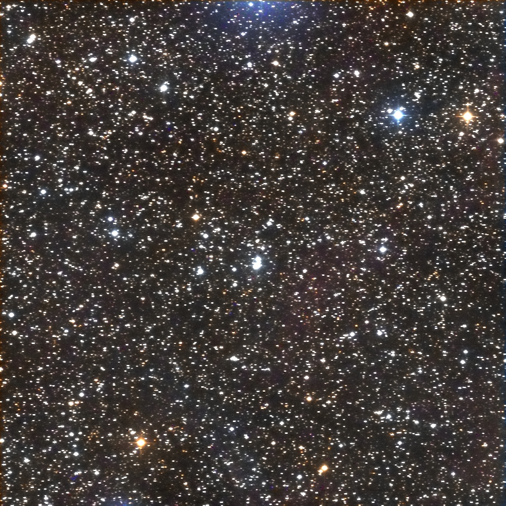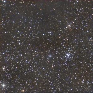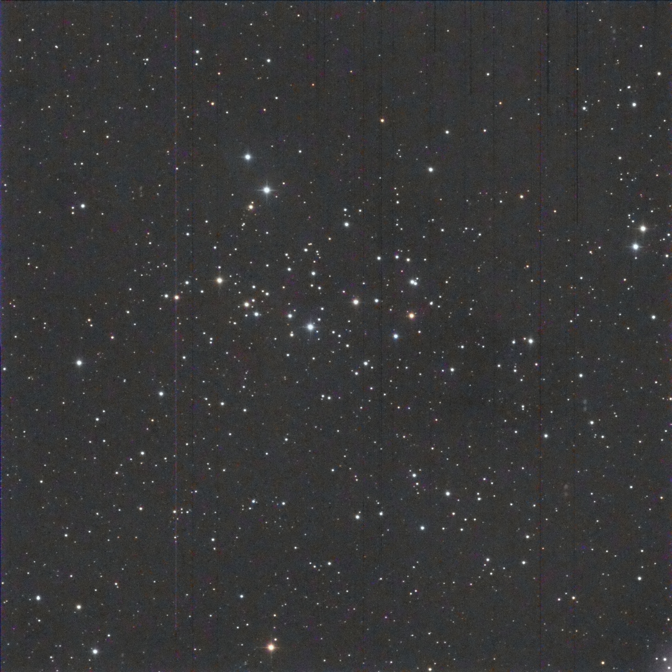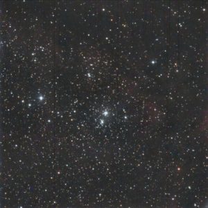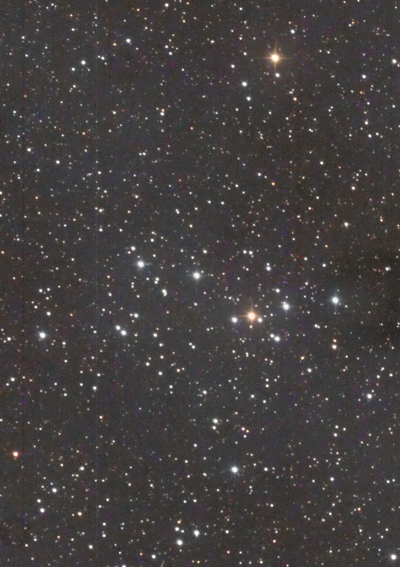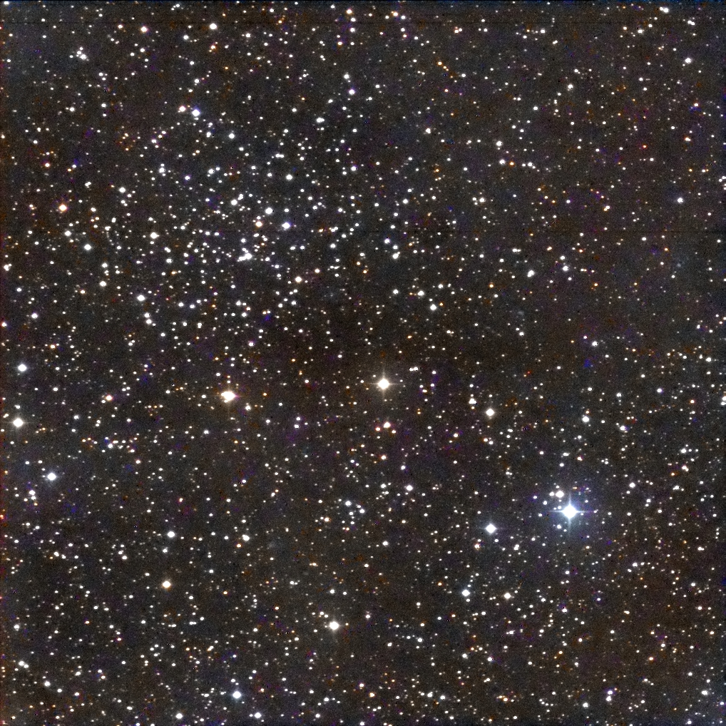 I targeted the bright star in the middle of the frame, SAO 23469.  It lies in the center of the cluster.  I had to crop out some very bad blemishes in the photo.  (These blemishes turned up in several photos taken by Canary Two on the night of September 30 – October 1.)