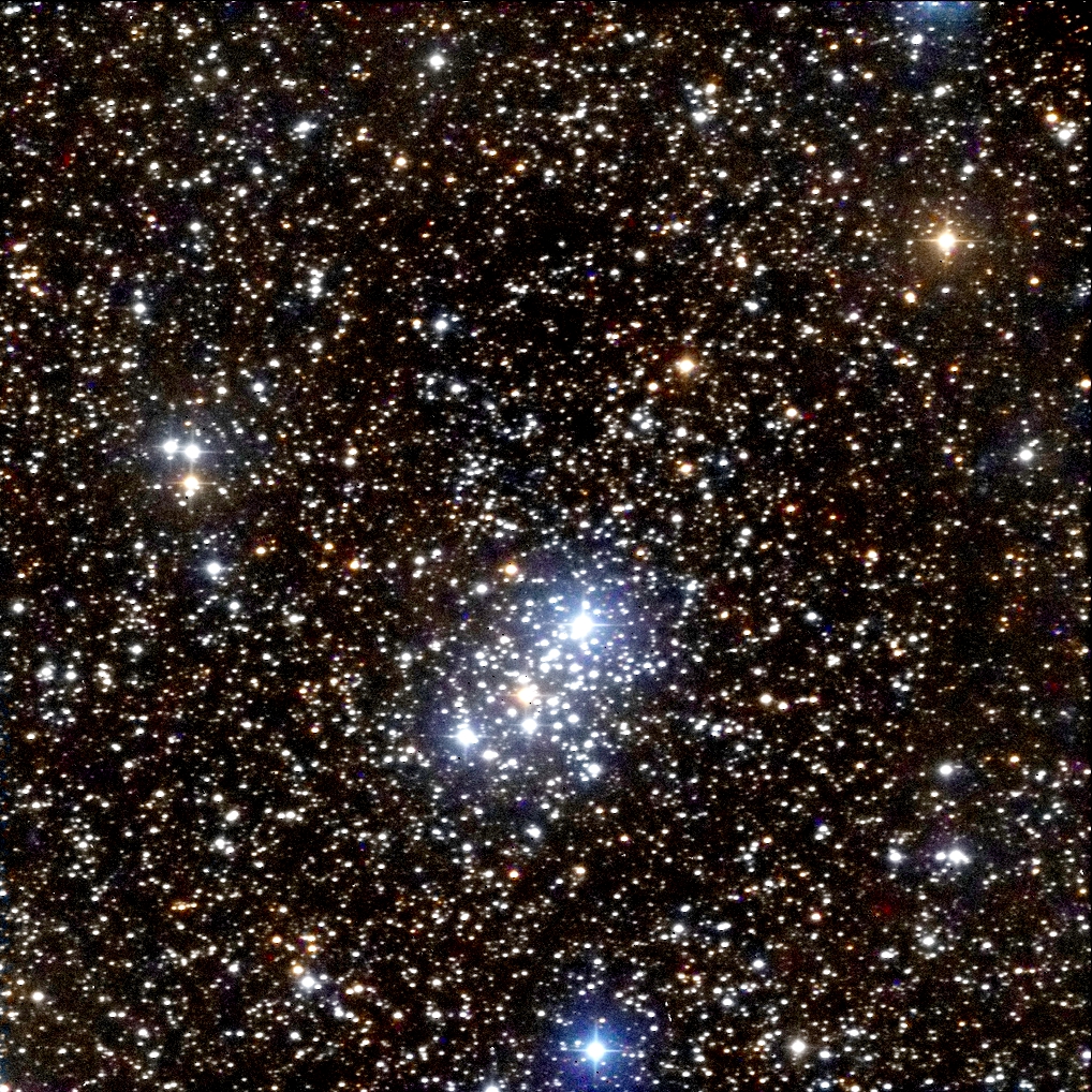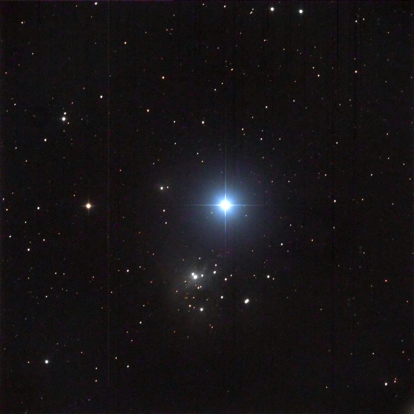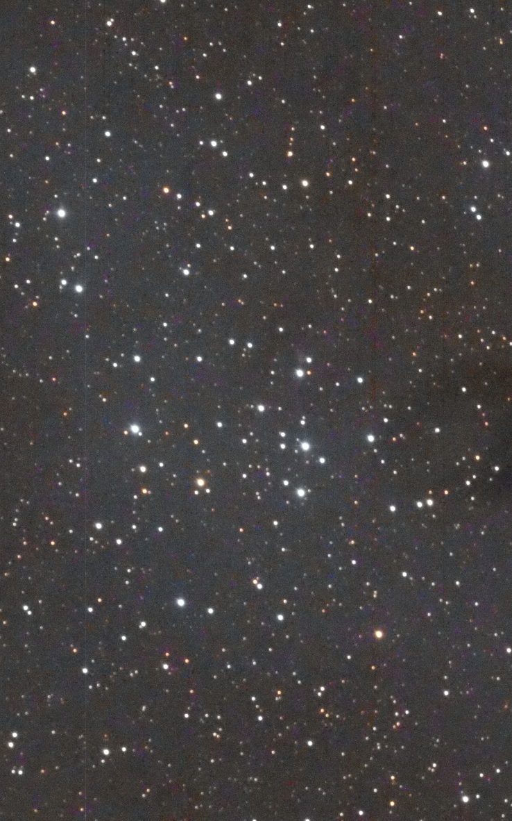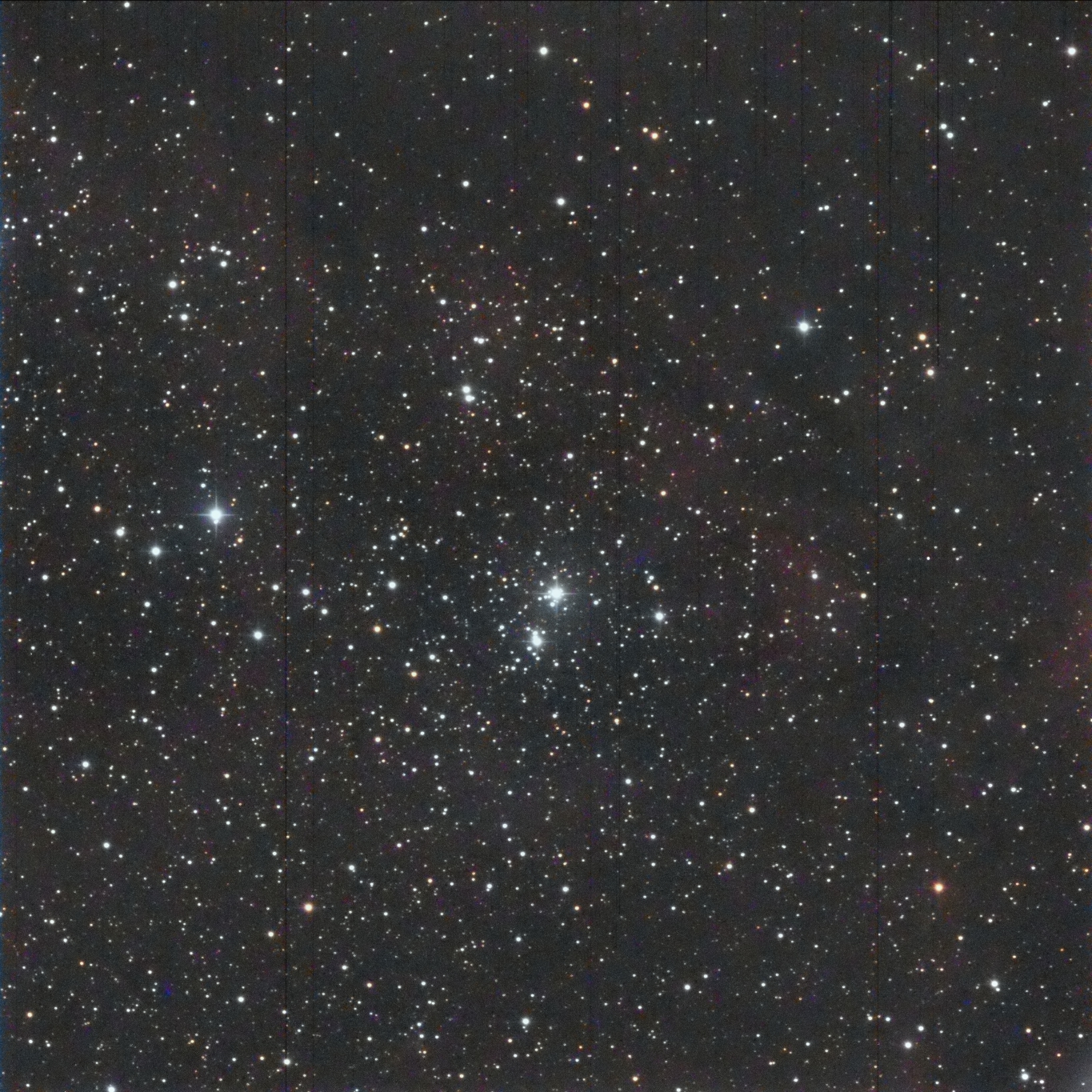 I targeted the bright star in the middle of the frame, SAO 23469.  It lies in the center of the cluster.  I had to crop out some very bad blemishes in the photo.  (These blemishes turned up in several photos taken by Canary Two on the night of September 30 – October 1.)