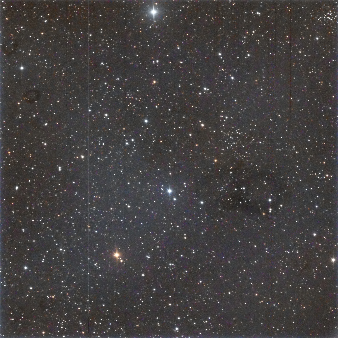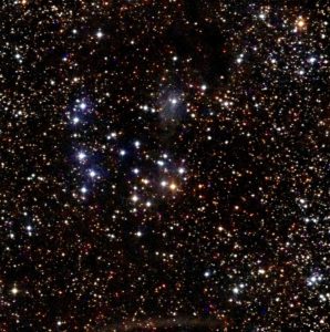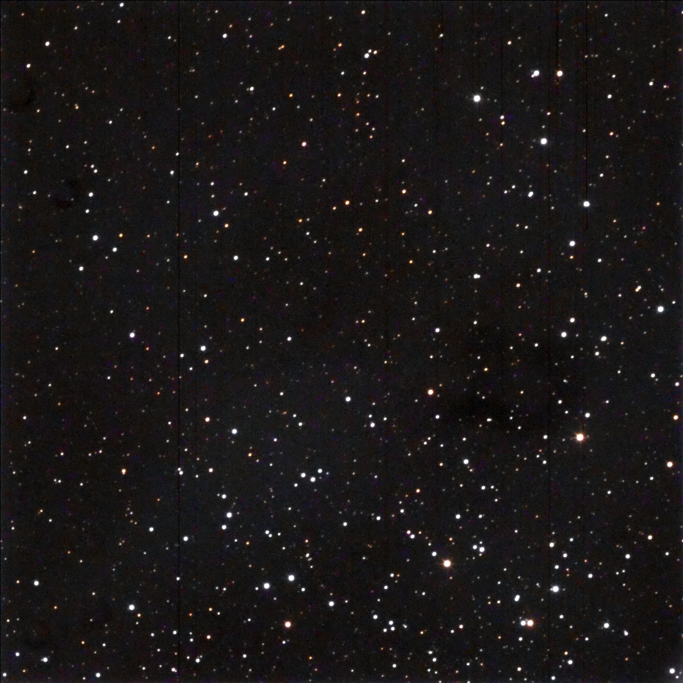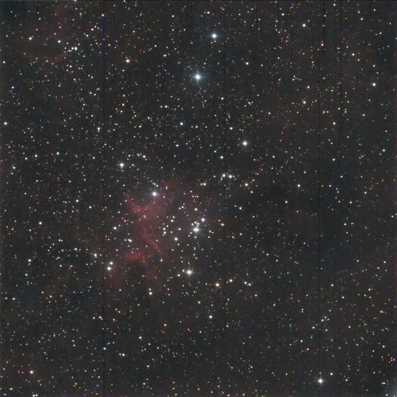 I targeted SAO 23906, the yellow star near the center of the image.  It is right in the middle of the cluster.  The dark area surrounding the cluster is, I think, dust derived dark nebulosity.