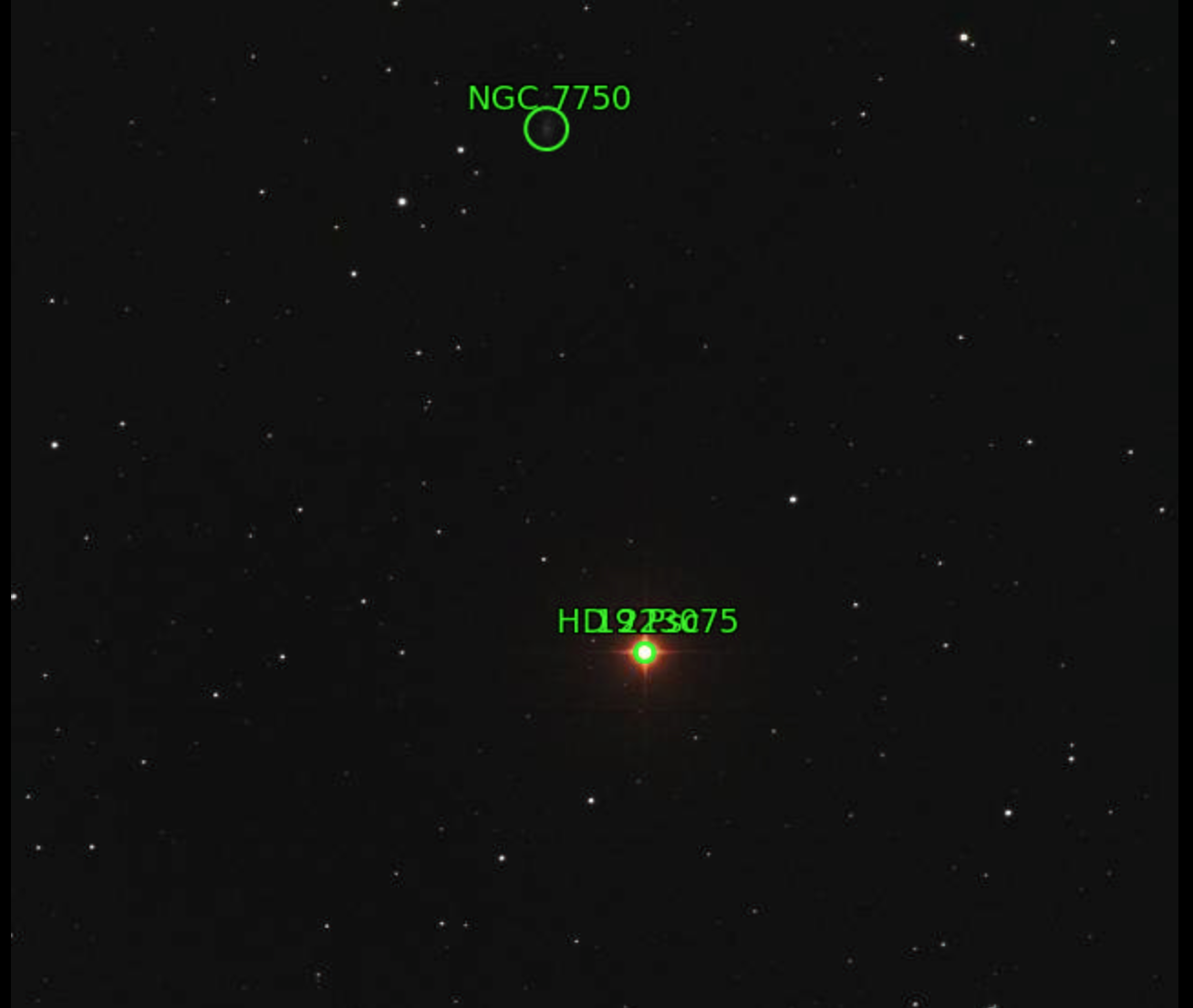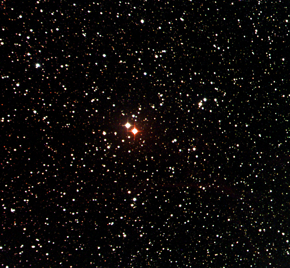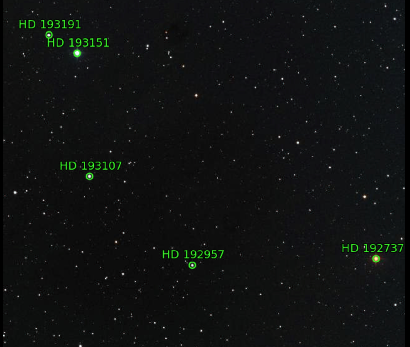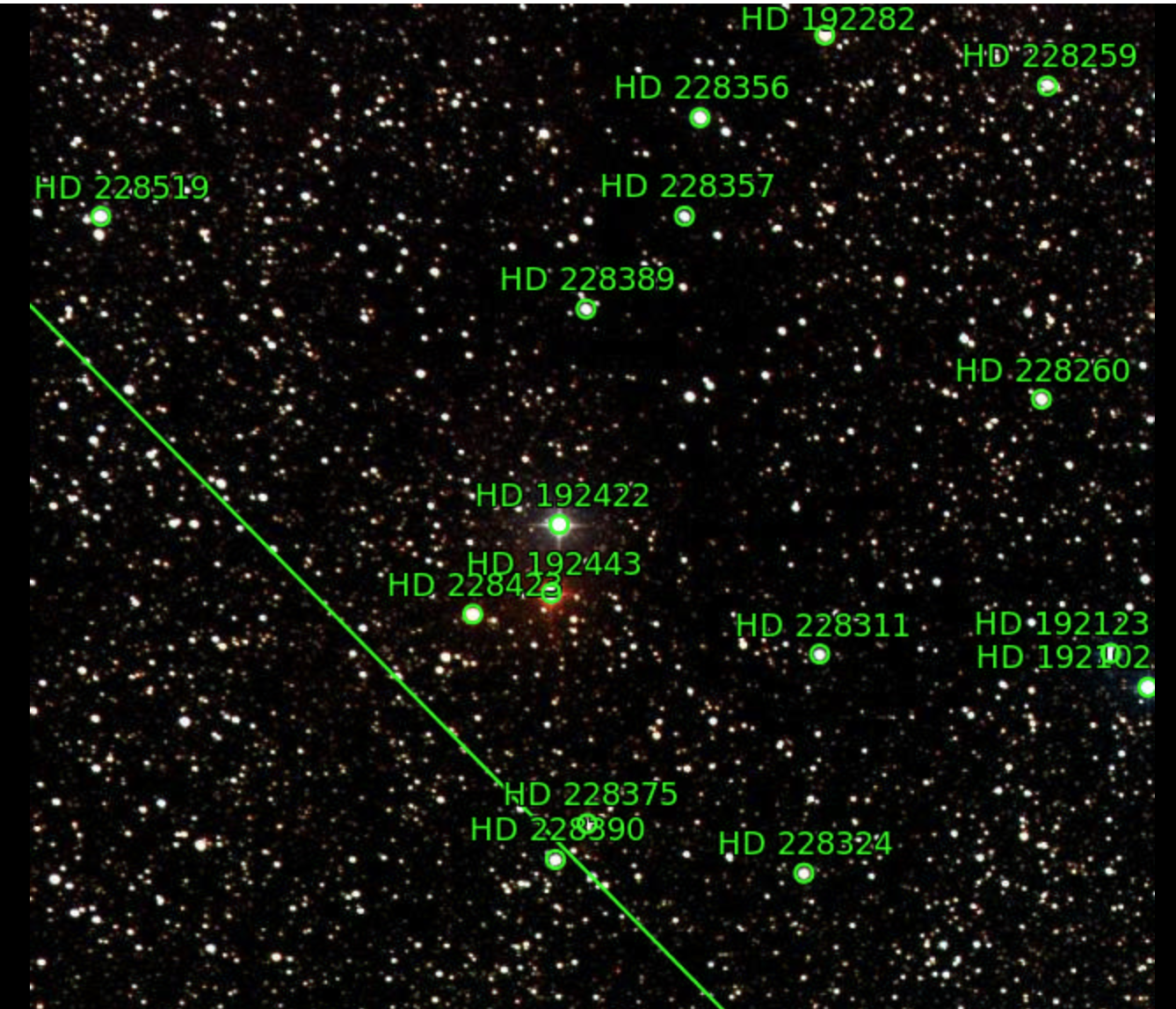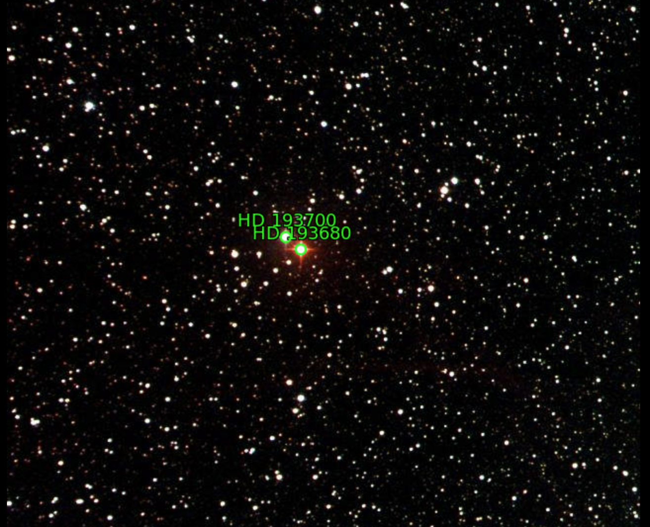 85. RS Cyg (HD 192443) / October 14, 2021 / 00:30 UTC / Canary 1 / How did the green stripe appear in the solved image when it is not in the original? Got me!