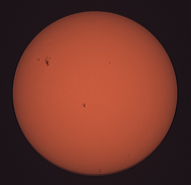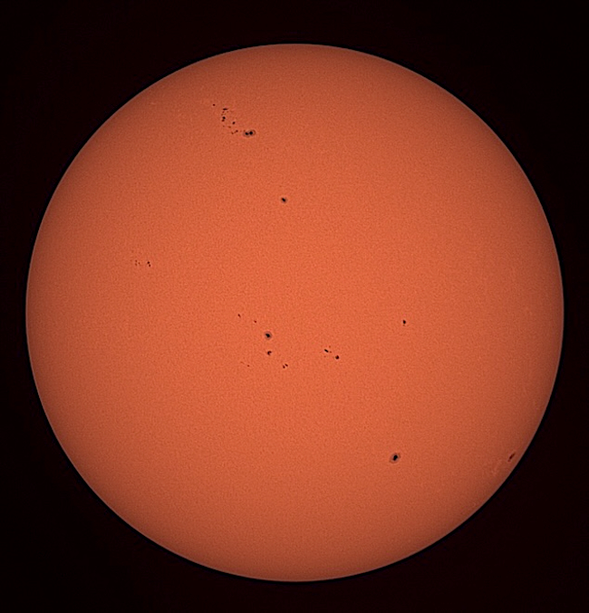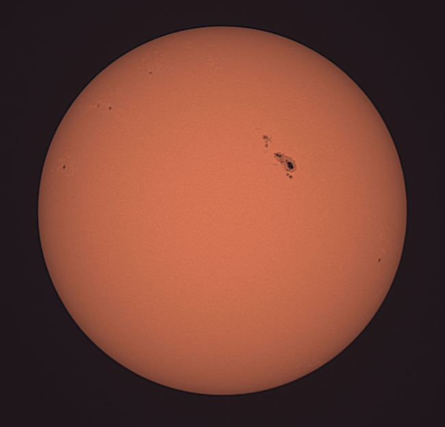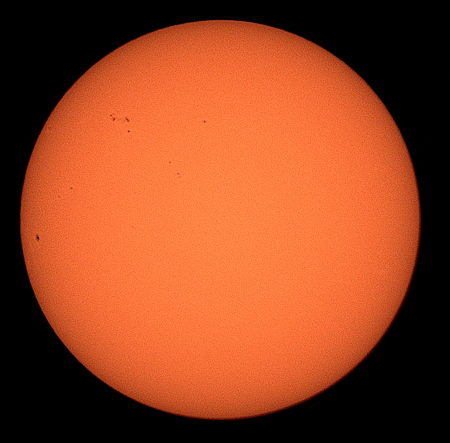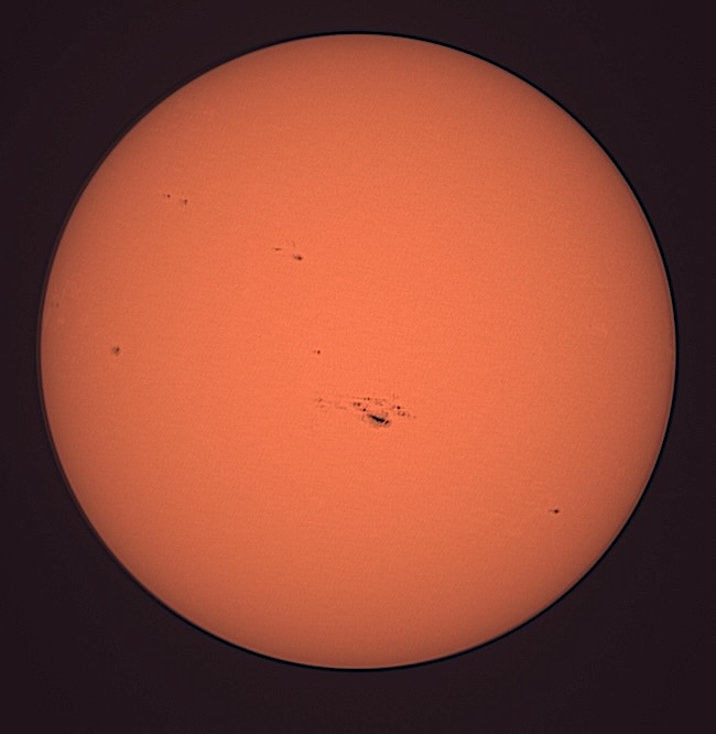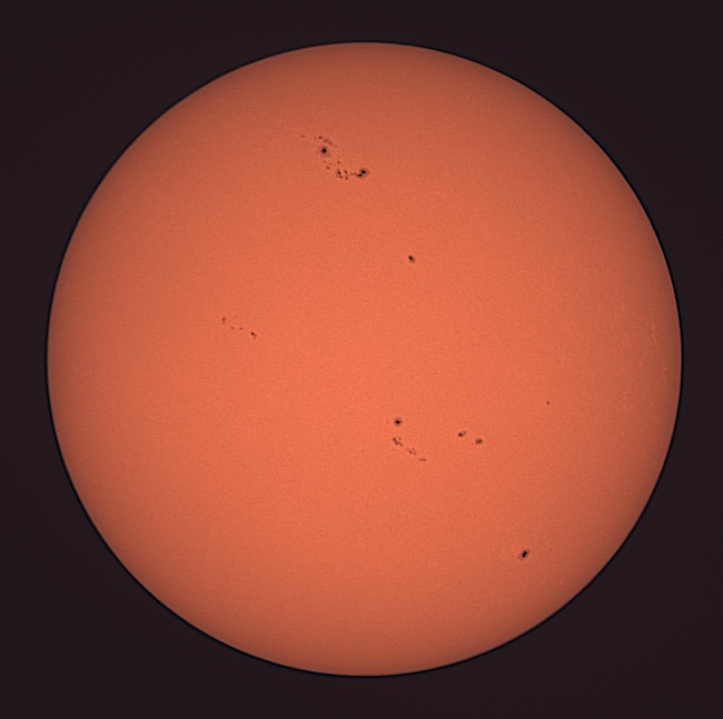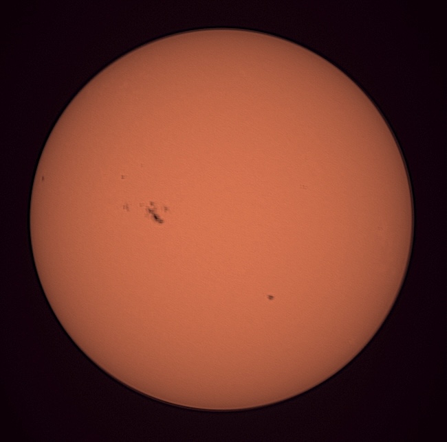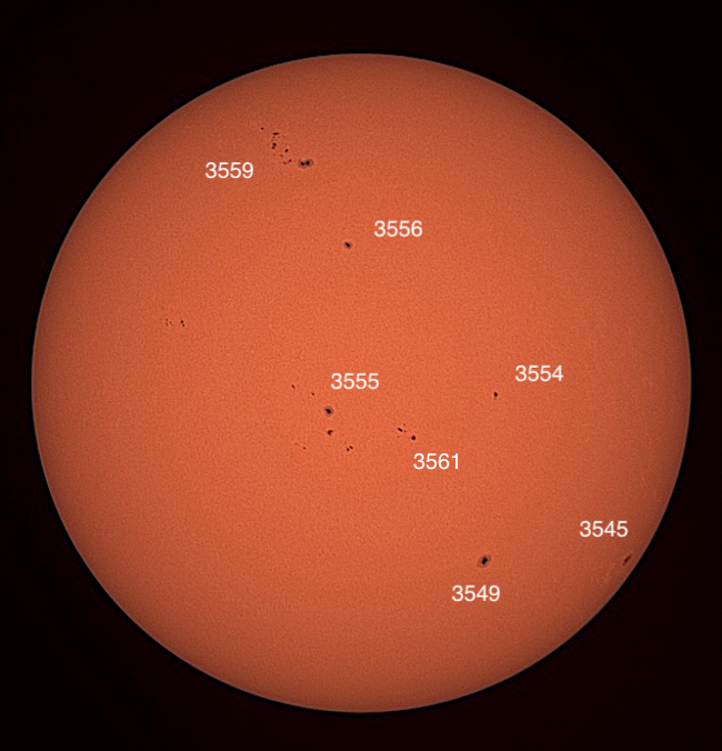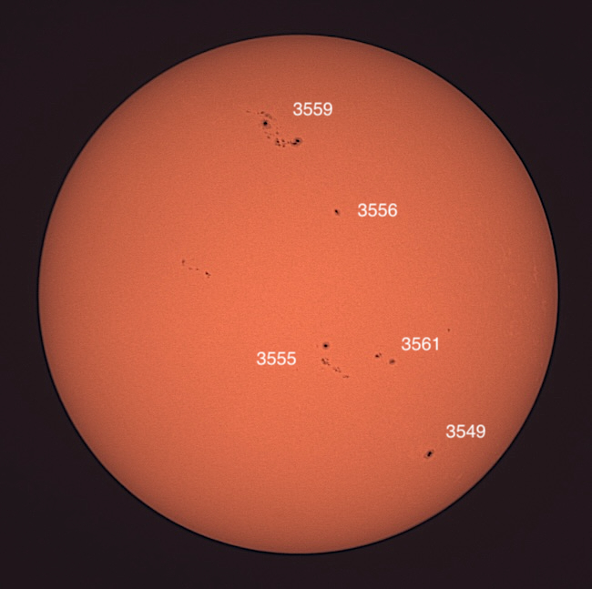 Region classifications: 3545 (HAX), 3549 (CSO), 3554 (HAX), 3555 (CSO), 3556 (HAX), 3559 (EAI), 3561 (DAO). To calculate the Wolf number, multiply the number of sunspot groups by 10, and then add the number of visible sunspots on the solar sphere. Wolf number = 108 (7 groups, 38 spots). This photo picks up a bit of granulation on the solar surface. Area 3545 may show Wilson effect. Also note facula near areas 3545 and 3559.