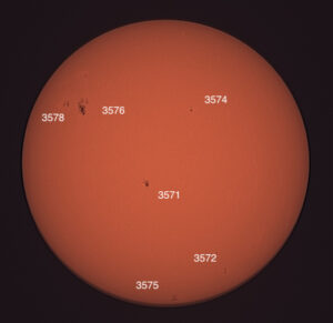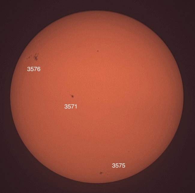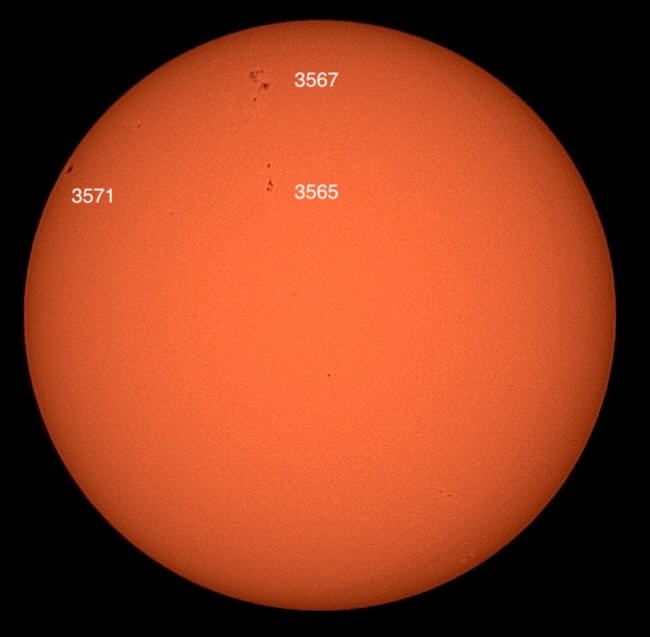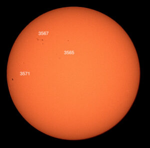 Region classifications: 3565 (DSO), 3367 (DAI), 3571 (HSX). Wolf number = 49 (3 groups, 19 spots). Area 3571 may show Wilson effect. Note facula near limb at 5 o’clock.