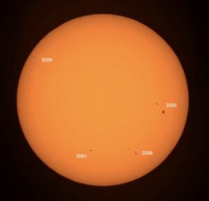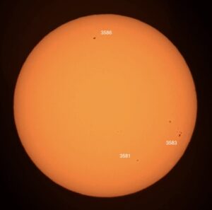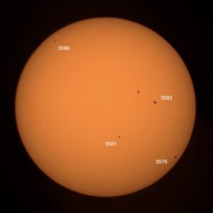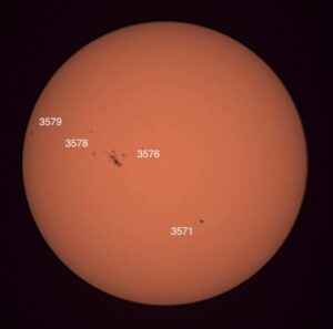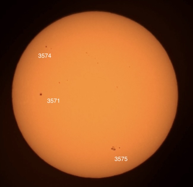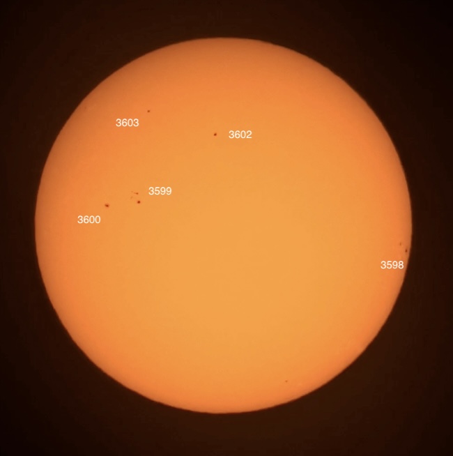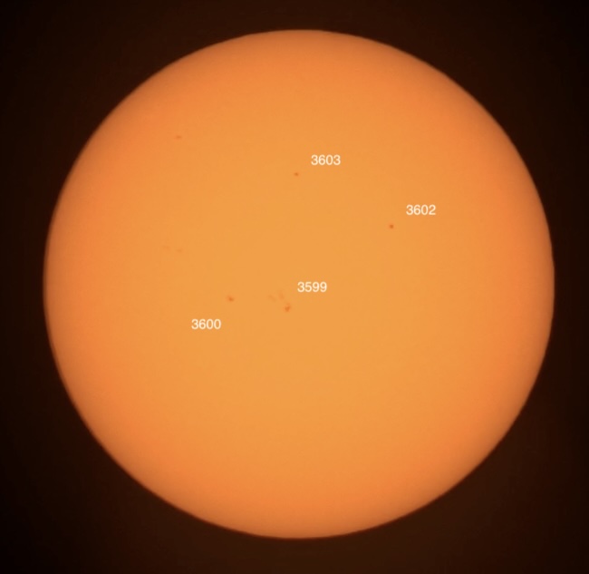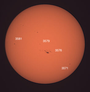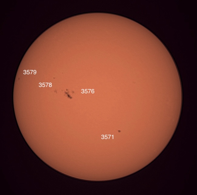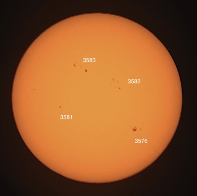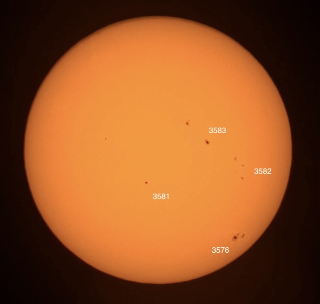 Pardon the clouds! Region classifications: 3576 (EKI), 3581 (HSX), 3582 (DAI), 3583 (EKI). Wolf number = 55 (4 groups, 15 spots).