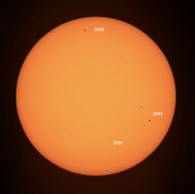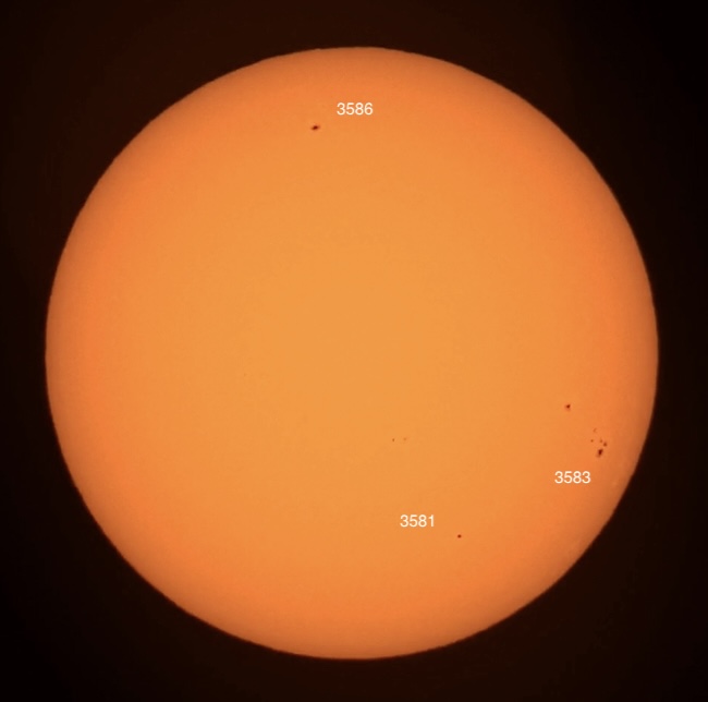 Region classifications: 3581 (HSX), 3583 (FKO), 3586 (HSX). Wolf number = 34 (3 groups, 4 spots). Activity seems to have waned a bit.