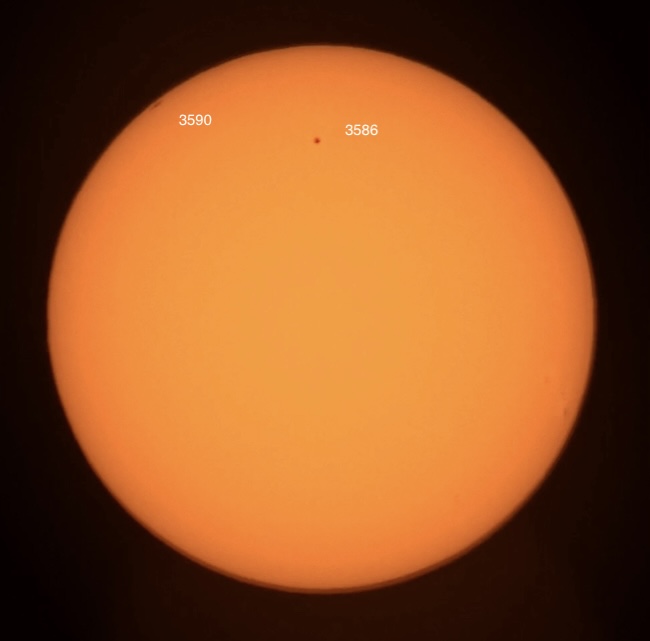 Region classifications: 3586 (HSX), 3590 (HHX). Wolf number = 23 (2 groups, 3 spots).