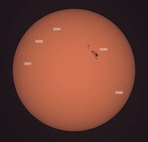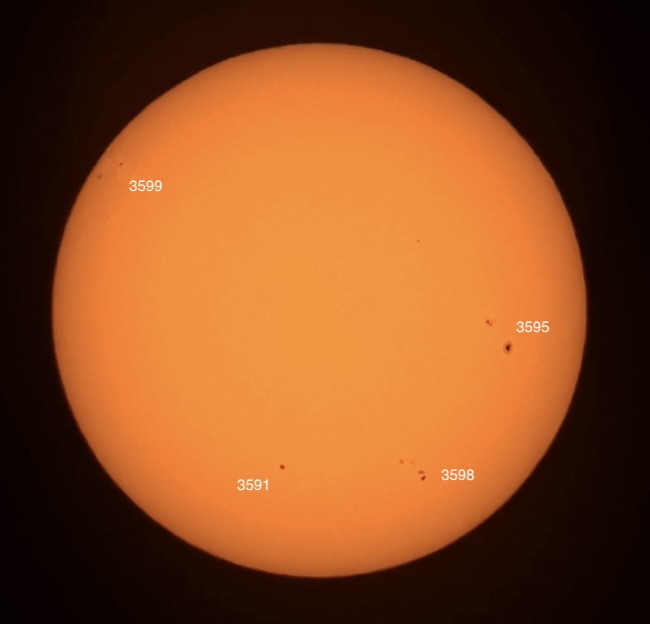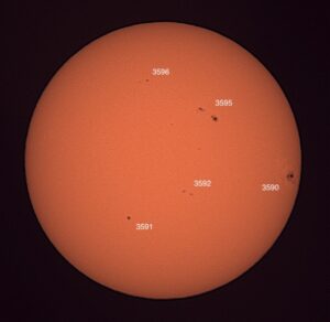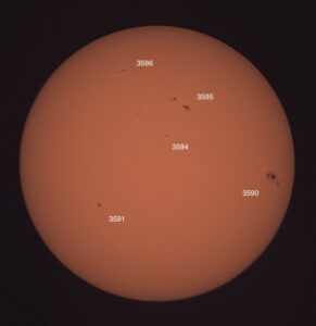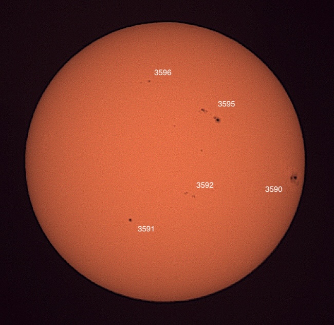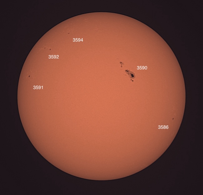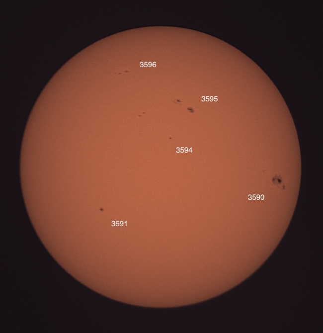 Region classifications: 3590 (FKC), 3591 (HSX), 3592 (AXX), 3594 (HRS), 3596 (CAO). Wolf number = 68 (5 groups, 18 spots). Granulation quite evident in photo. Area 3590 appears to show Wilson effect.