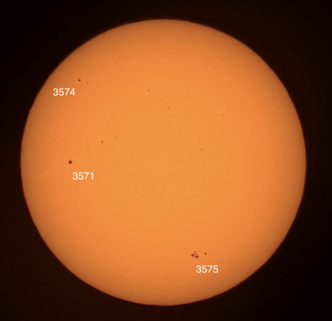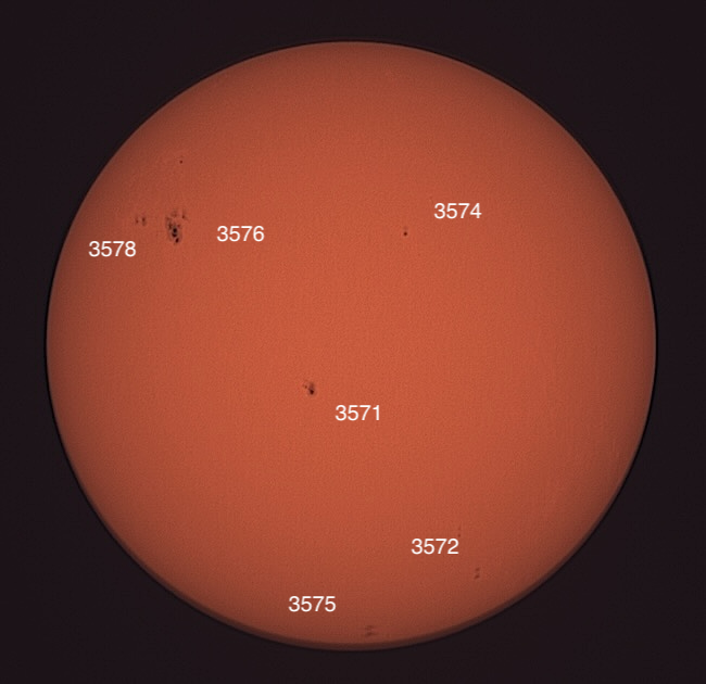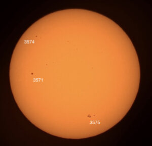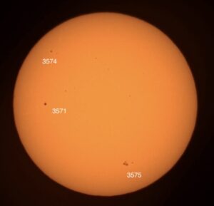 Region classifications: Wolf number = XXX (3571 (CSO), 3574 (CSO), 3575 (DKC). Wolf number = 42 (3 groups, 12 spots).