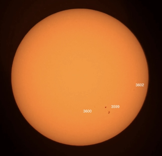 Region classifications: 3599 (DAI), 3600 (HRS), 3602 (HRX). Wolf number = 37 (3 groups, 7 spots).