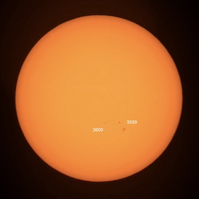 Region classifications: 3599 (DAI), 3600 (HSX). Wolf number = 26 (2 groups, 6 spots).